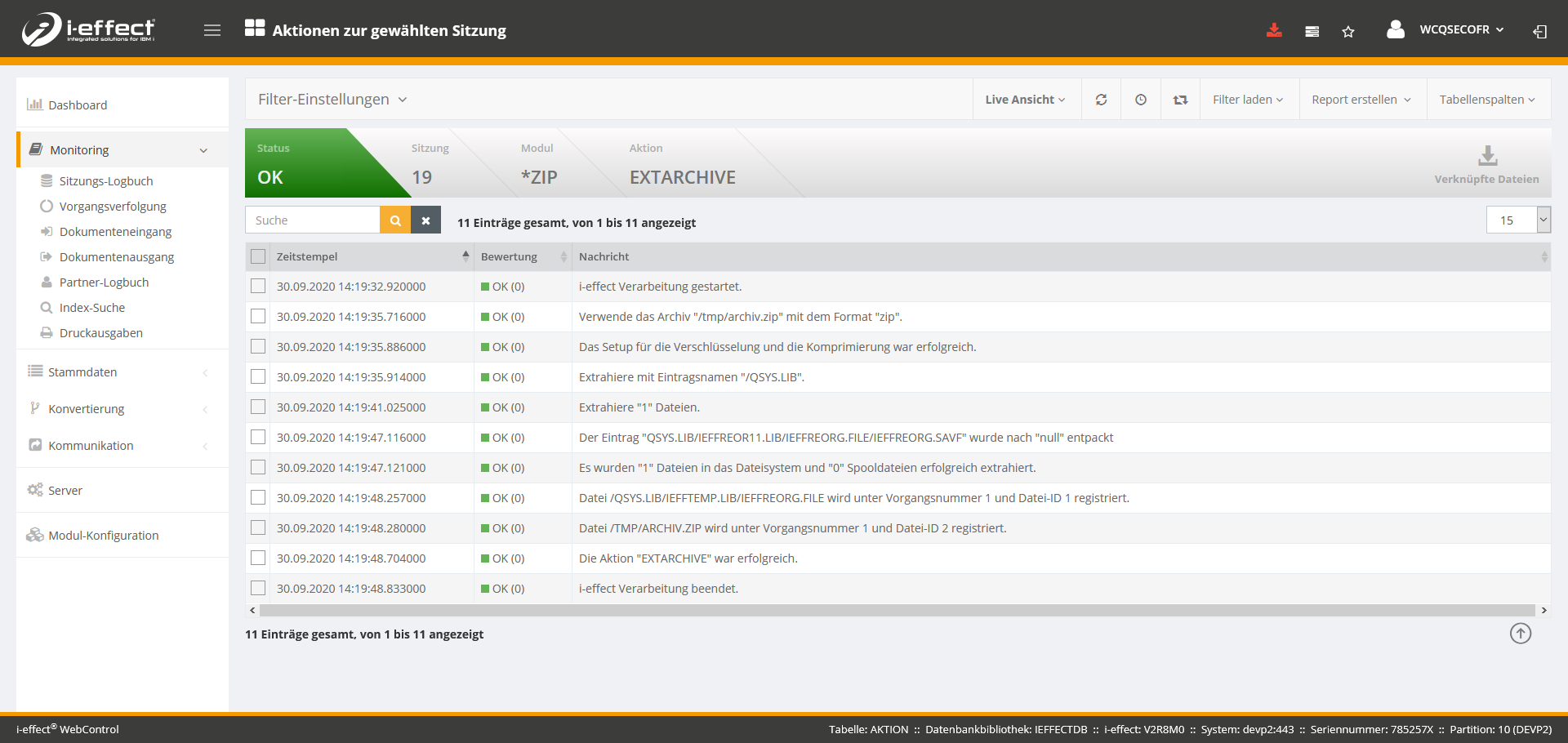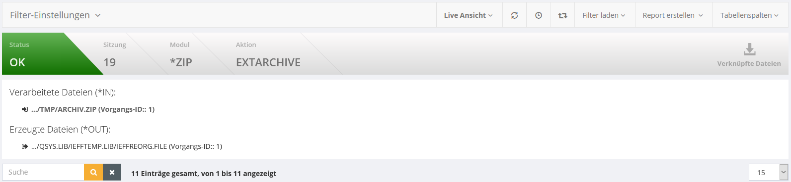 In der oberen Menüleiste sehen Sie die wichtigsten Informationen zu dieser Sitzung. Weiter unten sehen Sie die Tabelle mit detaillierteren Informationen. Der Nachrichtentext wird in der Tabelle jedoch nur als Kurztext ausgegeben, in der Detailansicht steht die vollständige Nachricht. Diese erreichen Sie durch das Klicken auf eine Aktion.