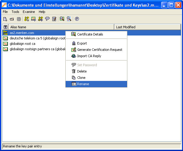 - Um einen Aliasnamen eines im Keystore gespeicherten Zertifikates zu ändern gehen Sie wie folgt vor: Bewegen Sie den Mauszeiger über das Zertifikat, dessen Aliasnamen Sie ändern möchten und betätigen Sie die rechte Maustaste. Folgendes Kontextmenü kommt zur Anzeige: