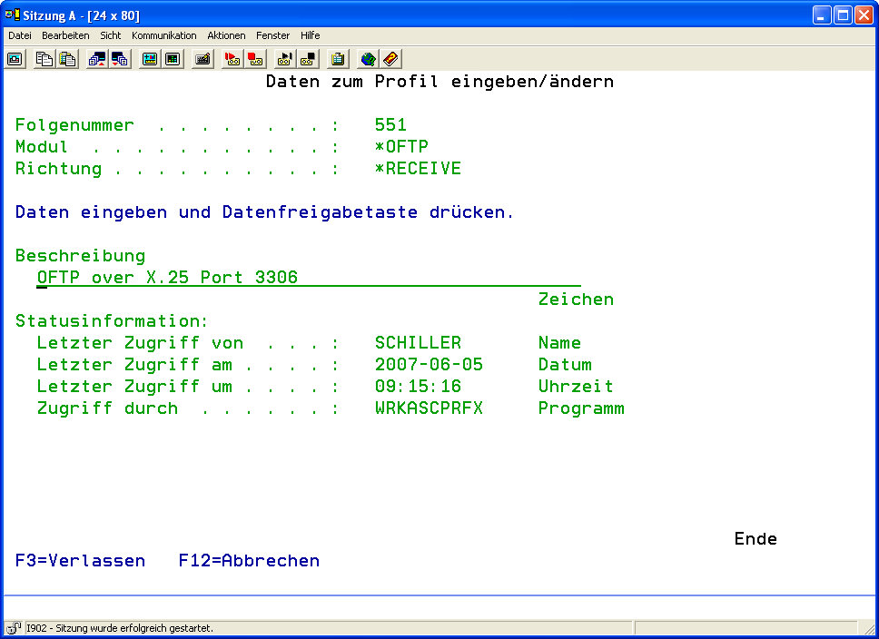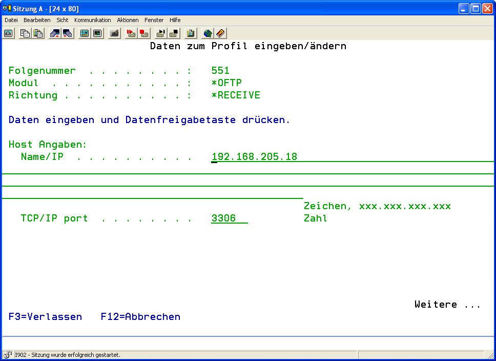 Rufen Sie nun durch Drücken von F6 das Menü zum Anlegen eines Kommunikatiosprofils auf und wählen anschließend mit Auswahl „1" den OFTP Kommunikationsweg aus. Im darauffolgenden Menü wählen Sie bitte dann den Eintrag „*RECEIVE" aus.