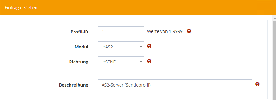 Dort wählen Sie bitte als Modul *AS2 und als Richtung *SEND. Vergeben Sie außerdem eine Profil ID (eine eindeutige Nummer die Sie diesem Profil zuordnen möchten).