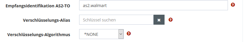 Geben Sie nun die AS2-Parameter der Verbindung an. Hierzu gehört der AS2-TO (also die Adresse des Empfängers), der Verschlüsselungsalias (Alias des Partner-Zertifikats im Keystore) und der Algorithmus für die Verschlüsselung.