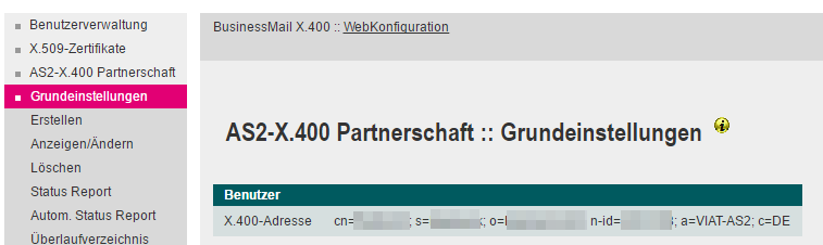 Über den Menüpunkt Grundeinstellungen kann die eigene X.400 Adresse angezeigt werden.