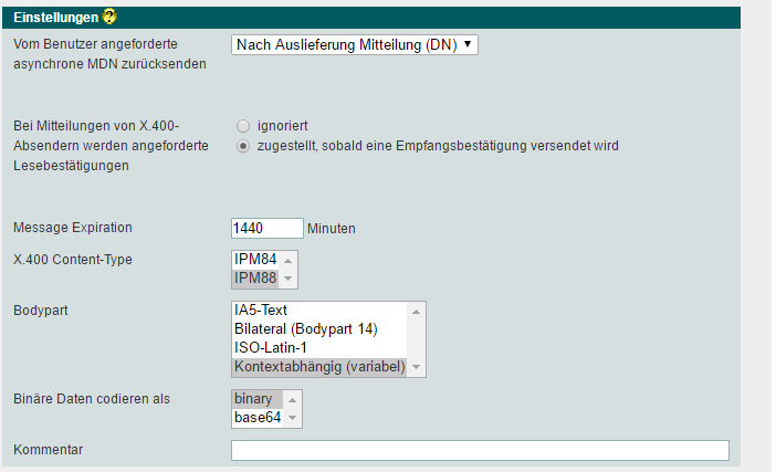 Die Standardangaben zu den X.400 Einstellungen können unverändert übernommen werden