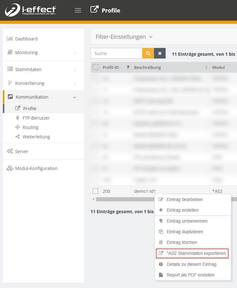 Dazu gehen Sie zum Menüpunkt Kommunikation → Profile → Kontextmenü (Rechtsklick) auf ein AS2-Receive Profil: