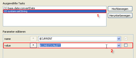 Bei den Bedingungs-Aufgaben sind diese reservierten Parameter nicht mit $CURRENT vorbelegt, sondern mit den beiden nur innerhalb der Bedingungs-Aufgaben verfügbaren Variablen $CONDITIONLEFT und $CONDITIONRIGHT.