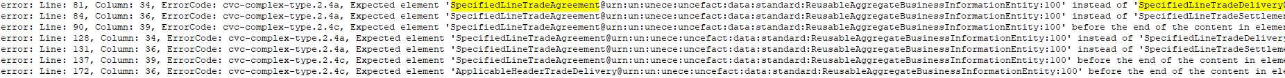 "Line: 81" bezieht sich auf die Zeile, in der der Fehler, in der fehlerhaften Datei, auftritt. "Expected element" steht für das Fehlen eines erforderlichen XML-Elements, welches anschließend genannt wird (hier: SpecifiedLineTradeAgreement). Darauf folgt der Name des Elements, welches eigentlich gefunden wurde.