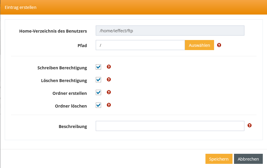 Wählen Sie "Neuen Eintrag erstellen" um neue Berechtigungen festzulegen. Möchten Sie beispielsweise Schreib- und Löschrechte auf dem Homeverzeichnis des Benutzers vergeben nehmen Sie folgende Einstellungen vor.
