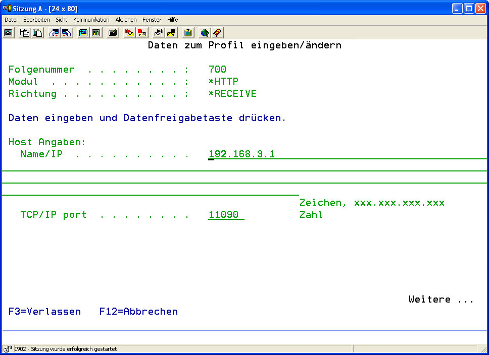 Rufen Sie nun durch Drücken von F6 das Menü zum Anlegen eines Kommunikatiosprofils auf und wählen anschliessend mit Auswahl „1" den HTTP Kommunikationsweg aus. Im darauf folgenden Menü wählen Sie bitte dann den Eintrag „*RECEIVE" aus.