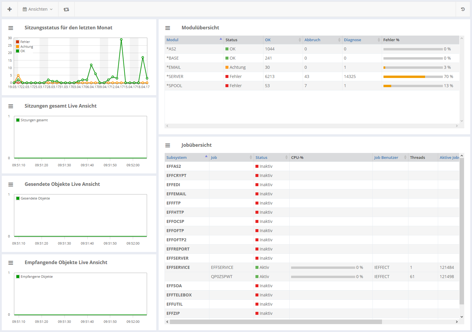 Das Dashboard gibt anhand von vielen verschiedenen Widgets einen Überblick über die Module, Jobs und Aktivitäten der Softwarelösung i-effect®.