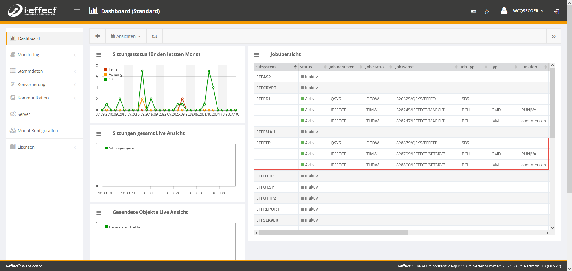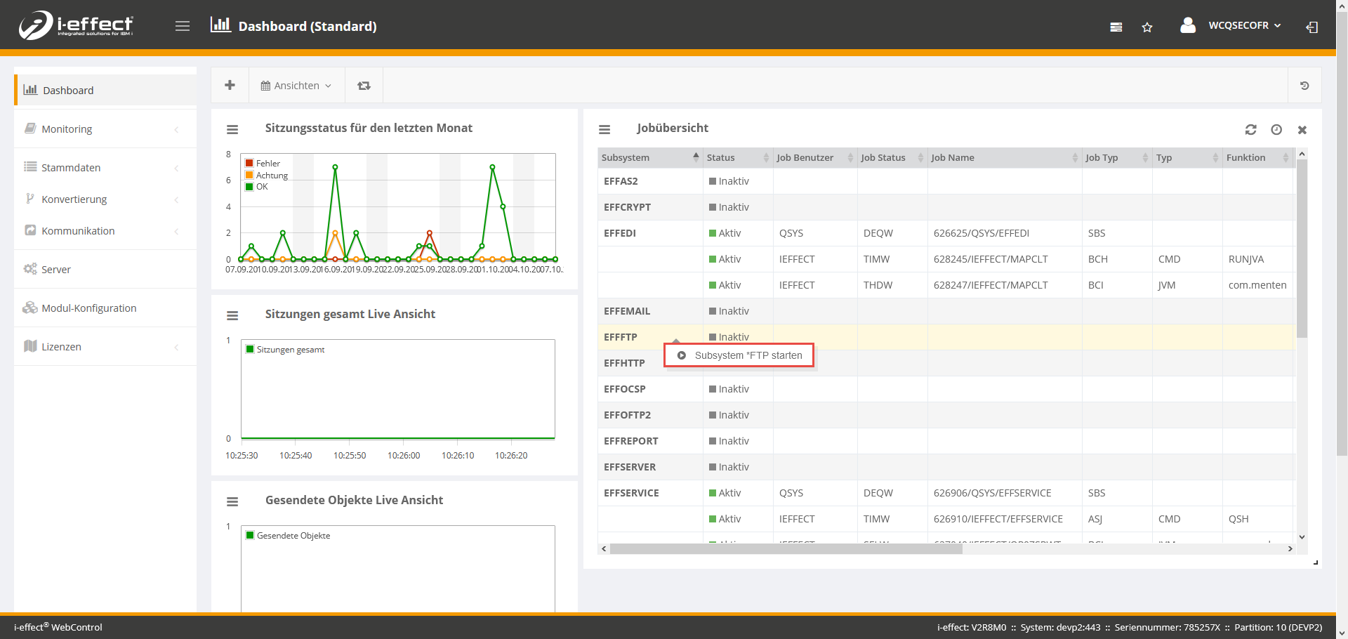Navigieren Sie zum Menüpunkt Dashboard dort angelangt starten Sie das FTP Subsystem mit Rechtsklick auf EFFFTP und wählen Sie Subsystem *FTP starten aus.