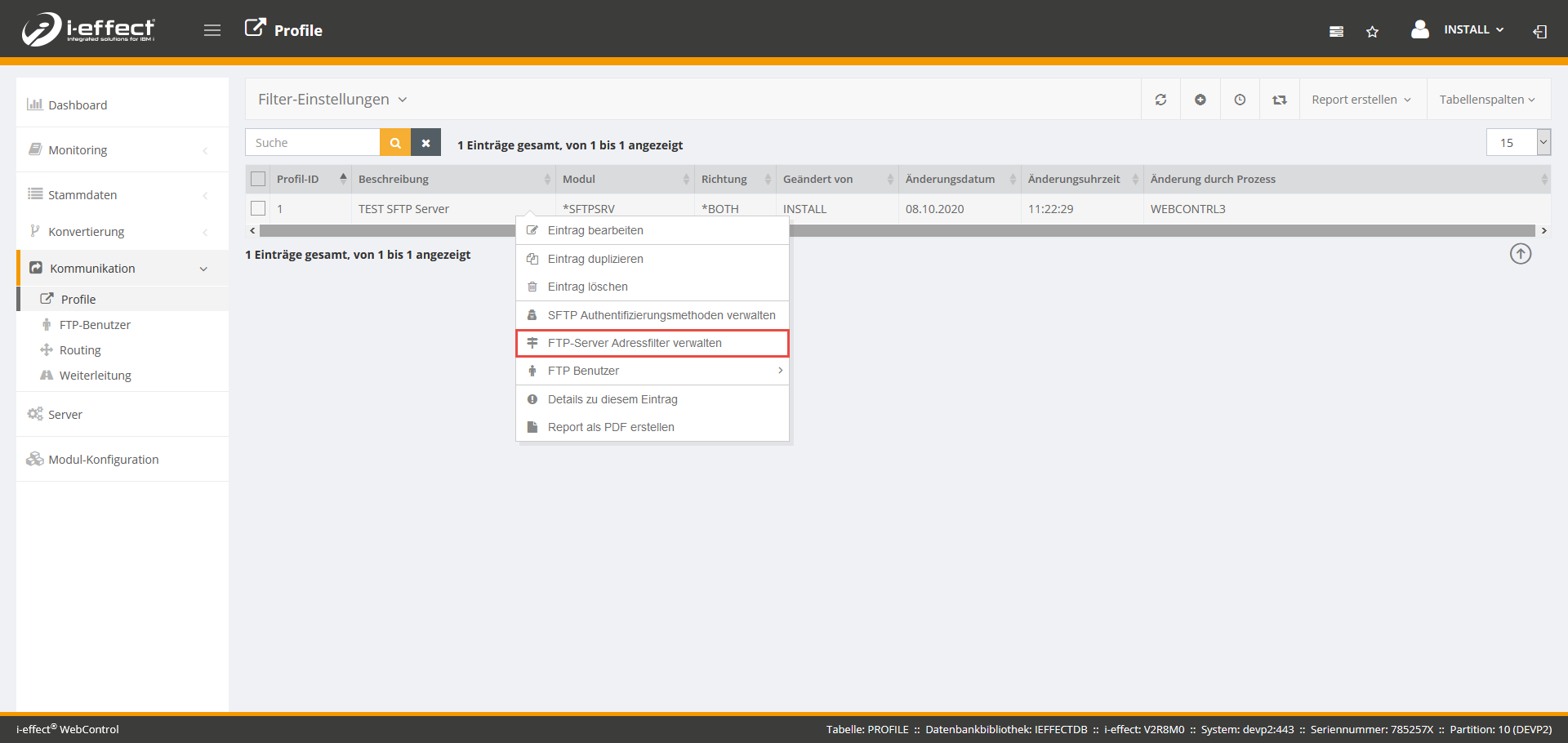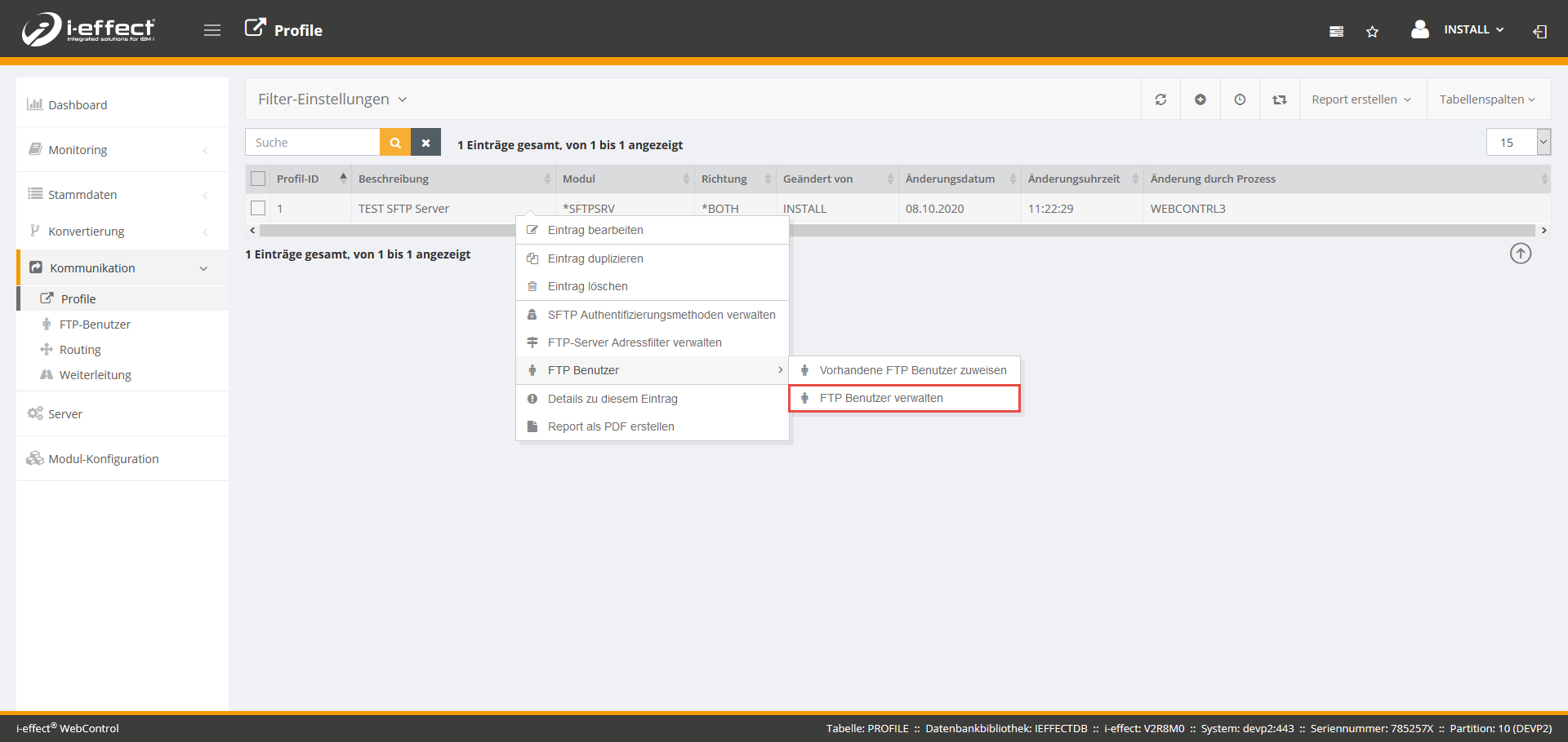 Nun müssen Sie noch einen FTP-Benutzer dem Kommunikationsprofil zuweisen, hierfür machen Sie einen Rechtsklick auf das zuvor erstellt Kommunikationsprofil und wählen FTP Benutzer verwalten.