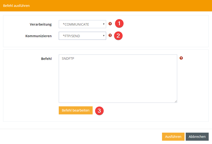 Hier wählen Sie für die Verarbeitung (1) *COMMUNICATE und für die Konvertierungsart (2) *FTP/SEND. Mit dem "Befehl bearbeiten" Button können Sie die folgenden Parameter für den Befehl bearbeiten: