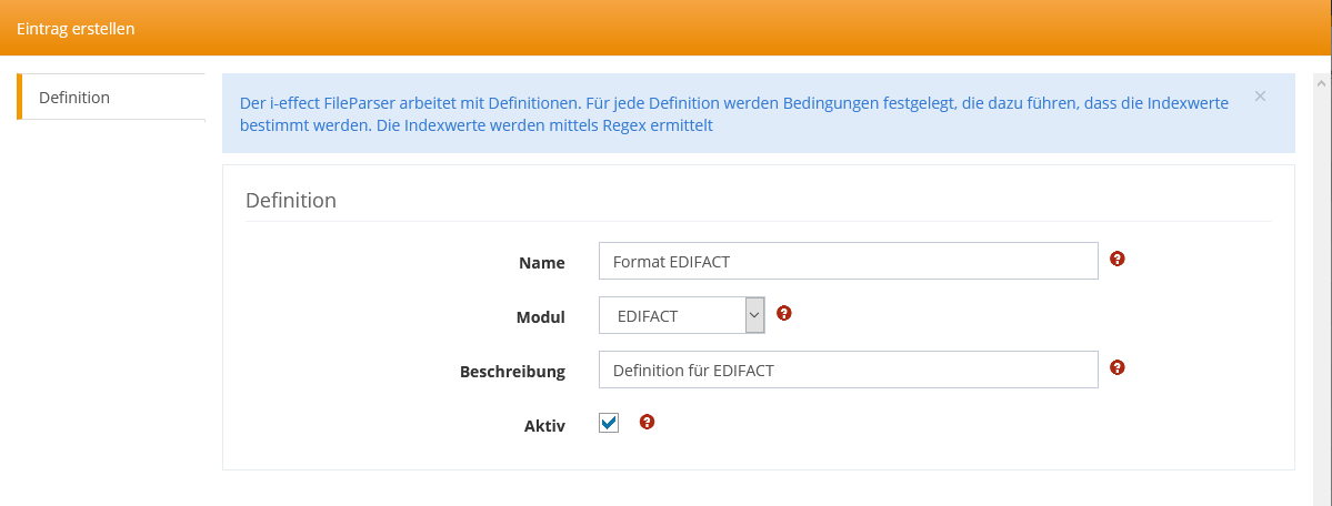 Wird beim Erstellen einer Definition das Modul MAPPER ausgewählt, können für dieses Modul nur Indexwerte definiert werden und der Eintrag hat keinen Aktiv Status. Die für das MAPPER Modul definierten Indexwerte dienen nur der Anzeige im Logbuch.
