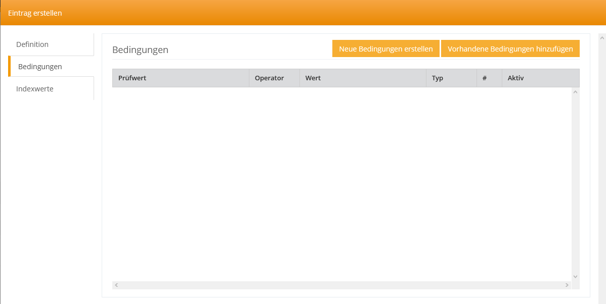 Einer neuen Definition sind noch keine Bedingungen zugeordnet. Bedingungen können aus den bereits existierenden Bedingen übernommen oder neu erstellt werden.