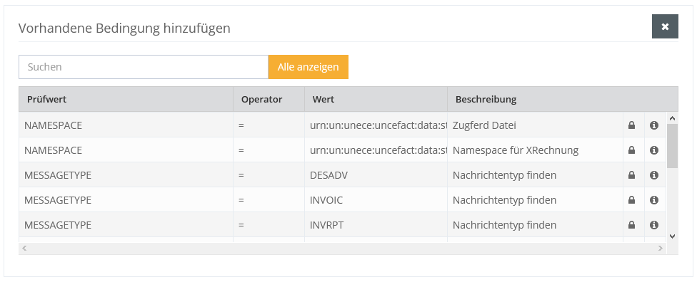 Über den Button "Vorhandene Bedingung hinzufügen", wird eine Liste aller bereits vorhandenen Bedingungen eingeblendet.