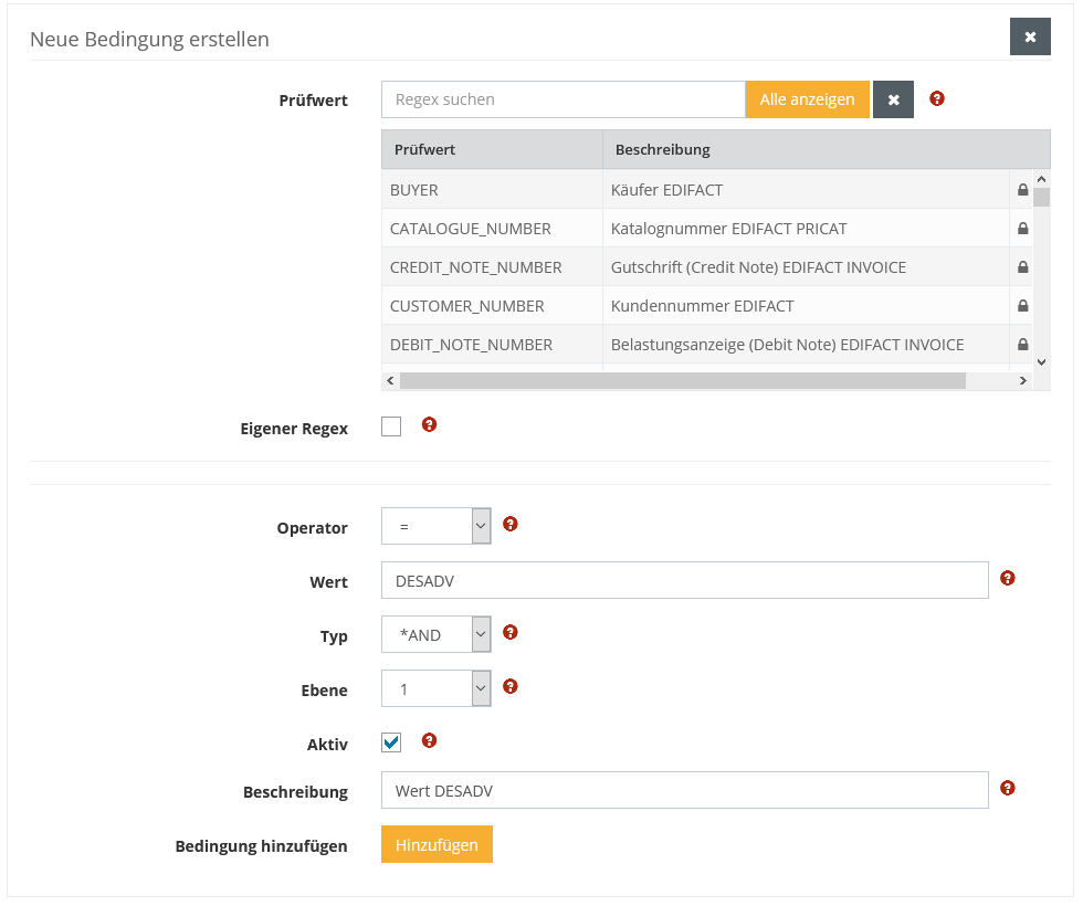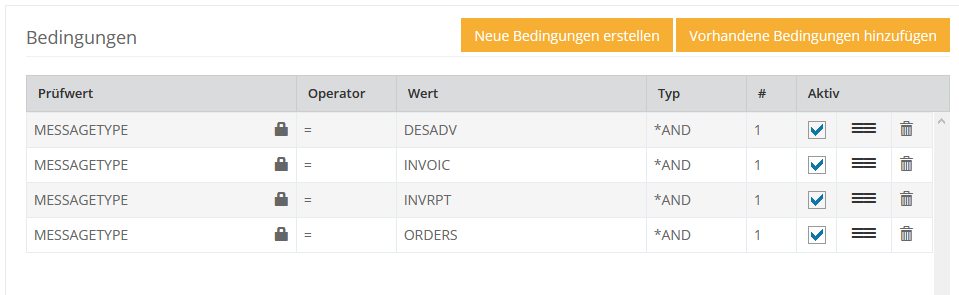 In der oberen Liste können Einträge direkt Aktiv oder Inaktiv geschaltet werden und die Position der Einträge lässt sich über den Marker uaf der rechten Seite per Drag-and-Drop verschieben. Über das Löschen Symbol ganz recht wird die Bedingung aus der aktuellen Definition entfernt, sie wird damit aber nicht gelöscht.