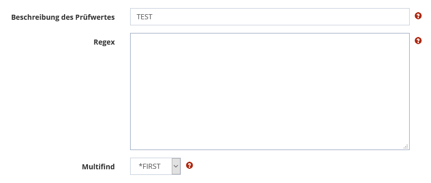 Es kann entweder ein Prüfwert aus den bestehenden Indexwerten ausgewählt werden, oder ein neuer Prüfwert nur für diese Bedingung erstellt werden, indem der Name und ein Regex angegeben werden. Bei einem neuen Regex muss dann über den Wert Multifind festgelegt werden, ob das erste oder das letzte Vorkommen ermittelt werden soll.