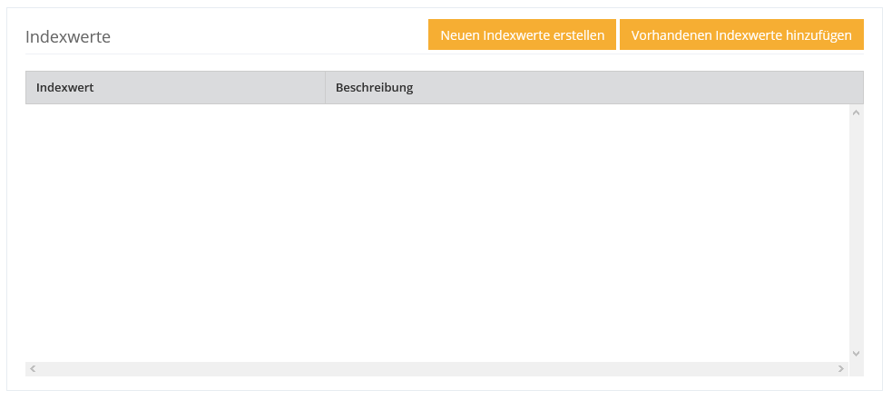 Einer neuen Definition sind noch keine Indexwerte zugeordnet. Indexwerte können aus den bereits existierenden Indexwerte übernommen oder neu erstellt werden.