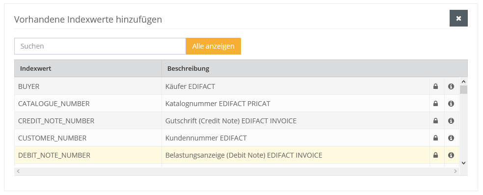 Diese werden per Mausklick in die Liste der zugeordneten Indexwerte übernommen. Hat eine solcher Indexwert ein Schloss-Symbol, gehört er zu den mit ausgelieferten Standard Indexwerten und kann nicht bearbeitet werden.