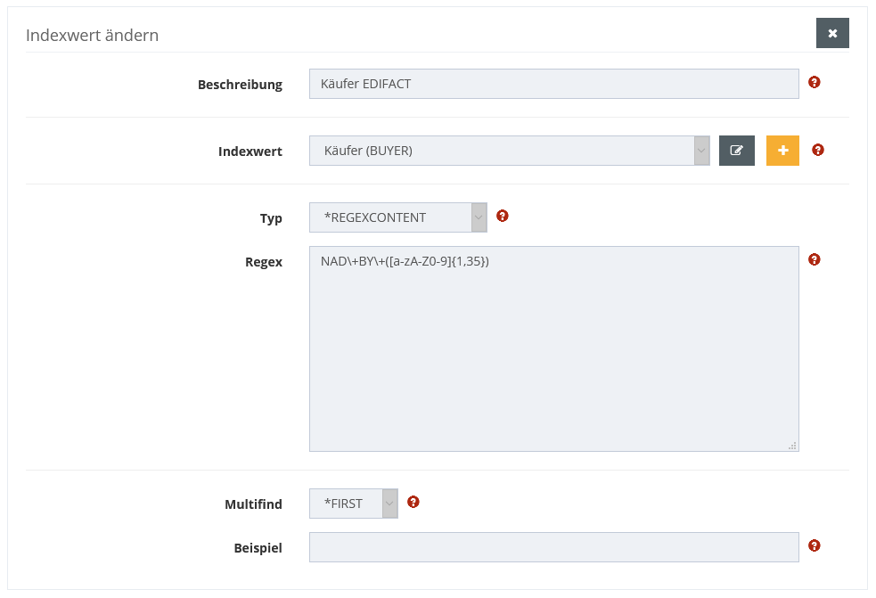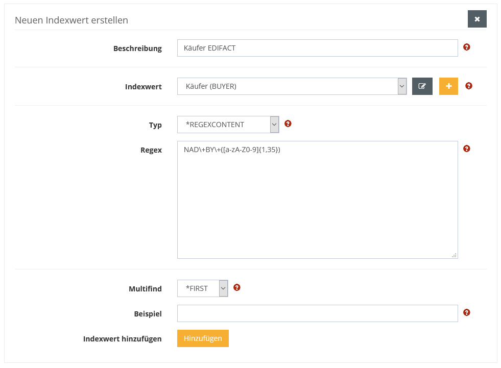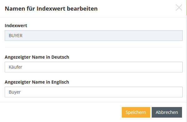 Es kann ein Indexwert aus den bestehenden Werten ausgewähhlt. oder über das + Symbol ein neuer Indexwert erstellt werden. Über das Bearbeiten Symbol neben dem Indexwert können die angezeigten Namen des Indexwertes in Deutsch und Englisch bearbeitet werden. Unter diesen Namen wird der Wert im Dokumentenein- und Ausgang gezeigt. Weiterhin muss ein Regex zum finden des Wertes eingegeben werden. Über den Wert Multifind wird festgelegt ob das erste oder das letzte Vorkommen ermittelt werden soll.