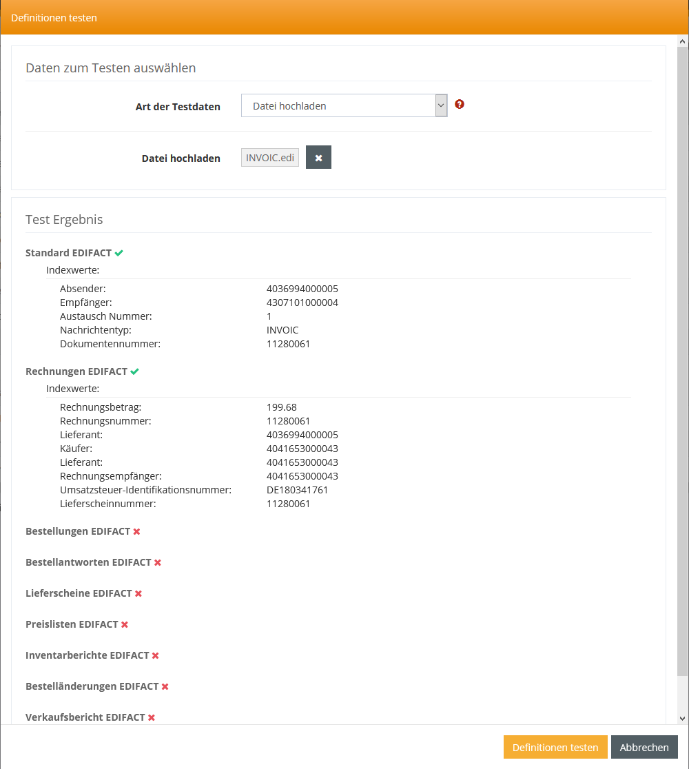 Nach der Auswahl der Testdaten wird der Testen Button unten im Formular freigeschalten und mit einen Klick darauf wird der Fileparser auf die Testdaten angewendet und das Ergebnis für die einzelnen Definitionen präsentiert.