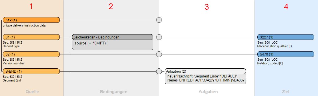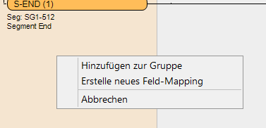 Der Quellbereich 1 nimmt Elemente aus der Quellsicht auf, deren Werte in entsprechende Zielfelder zu mappen sind. Der Editor nimmt nur Elemente, die zu einer Gruppe gehören (z.B. alle Datenelemente des DTM-Segments, bzw. alle Spalten einer Tabelle) in einer Übersicht auf. Der Editor erkennt, ob ein Element zu einer Gruppe gehört, und bietet bei einem Drop des Elements in den Quellbereich ein Kontextmenü an: Ein Element kann einer Gruppe hinzugefügt werden oder zu einem neuen Mapping in einer neuen Übersicht führen.