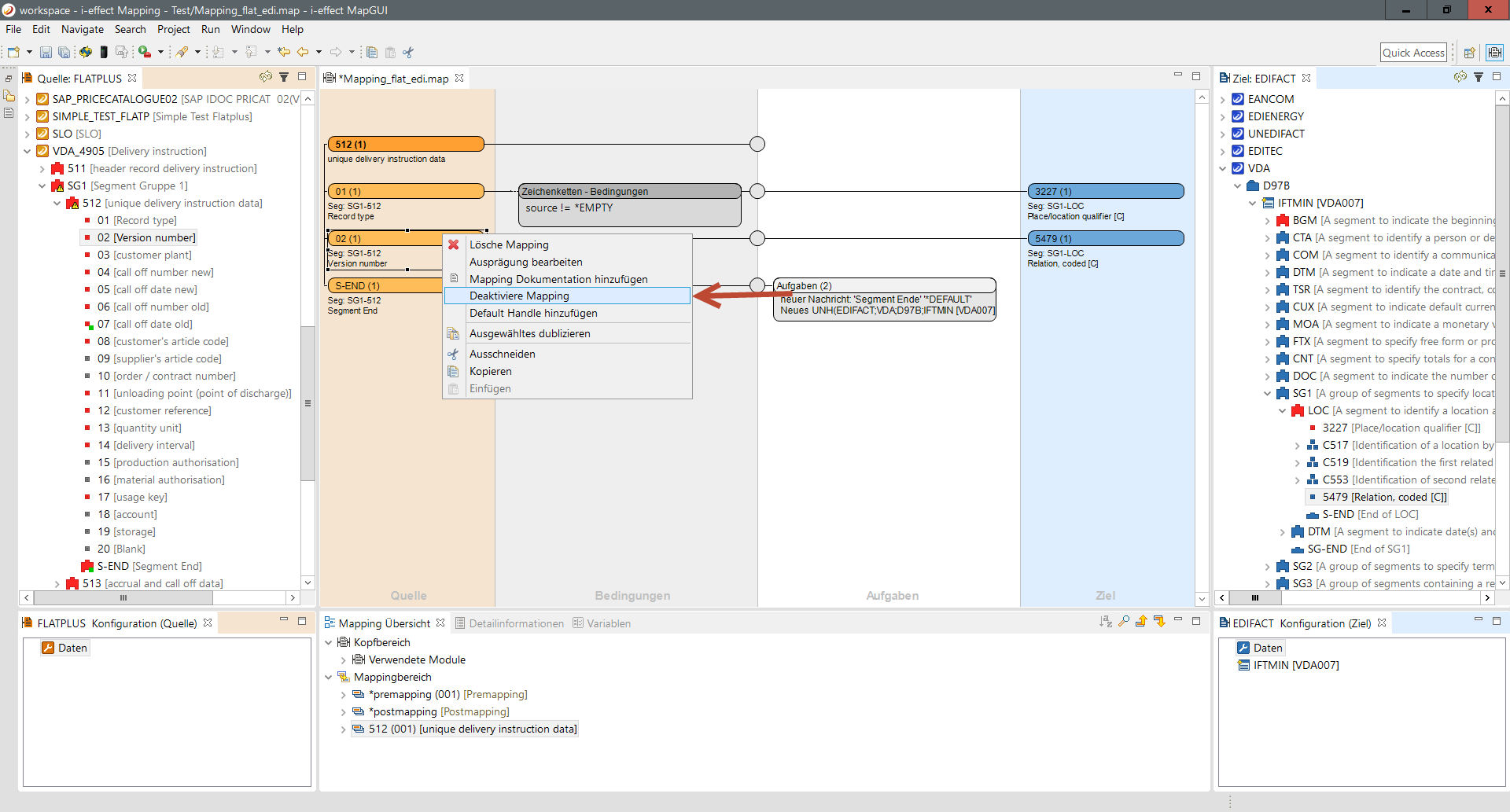 Innerhalb von einer Gruppe können einzelne Mappings, die im realen Mapping-Prozess keine Berücksichtigung finden, deaktiviert werden. Ein Mapping wird über sein Quellelement deaktiviert und reaktiviert. Mit einem Rechtsklick auf dem Quellelement kann aus dem erscheinenden Kontextmenü der Punkt Deaktiviere Mapping ausgewählt werden.