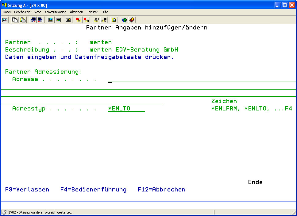 | Hinzufügen (Auswahl F6) | Mit der Auswahl F6 legen Sie eine neue Adresse an. Legen Sie im nachfolgenden Dialogprogramm den Adressname sowie Adresstyp fest. |
