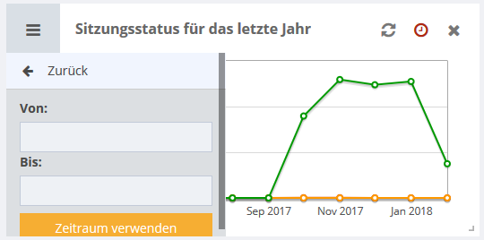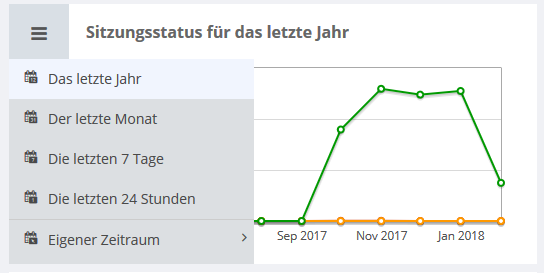 Die Anzeige kann über das Menü angepasste werden. Es kann sowohl ein fester Zeitraum, als auch ein freies Datum gewählt werden. Um ein freies Datum festzulegen öffnen Sie das Dropdown und wählen Sie eigener Zeitraum.
