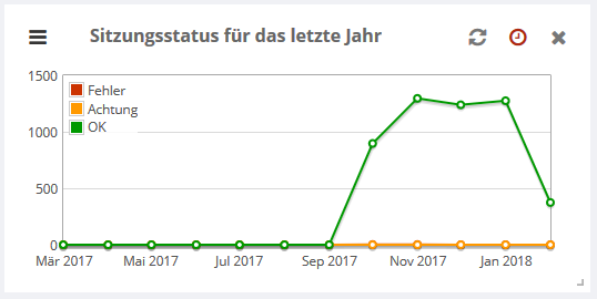 Der Sitzungsstatus vergleicht dabei in einer Ansicht die fehlerfreien, abgebrochen und fehlerhaften Sitzungen, während die anderen Diagramme jeweils nur einen Wert anzeigen.