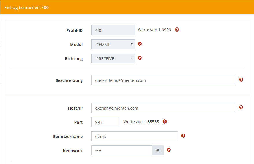 Bei der Anlage des Profils wählen Sie bitte als Modul *EMAIL und als Richtung *RECEIVE.