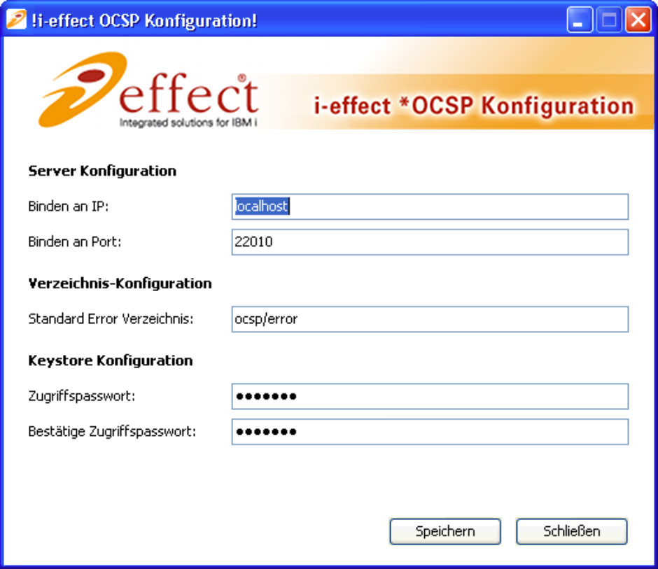 Die Einrichtung von i-effect *OCSP erfolgt über einen Konfigurationsdialog. Um den Konfigurationsdialog zu öffnen, wechseln Sie bitte in das Installationsverzeichnis von i-effect - die integrierte Lösung für IBM i - und in das dortige Unterverzeichnis OCSP.