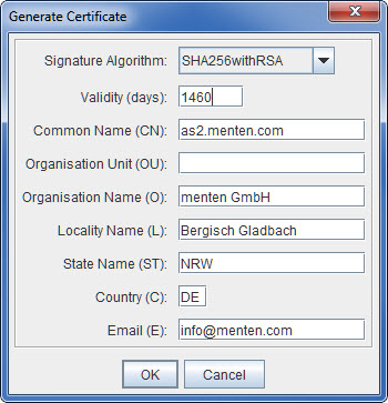 Wählen Sie bei „Signature Algorithm" die Einstellung „SHA256withRSA" und tragen nachfolgend Ihre Zertifikatsdetails ein. Bestätigen Sie mit am Ende mit OK. Weiter unten finden Sie eine Erläuterung der Eingabefelder. Im nächsten Dialog werden Sie nun dazu aufgefordert dem eben generierten Schlüsselpaar einen Aliasnamen zu vergeben.