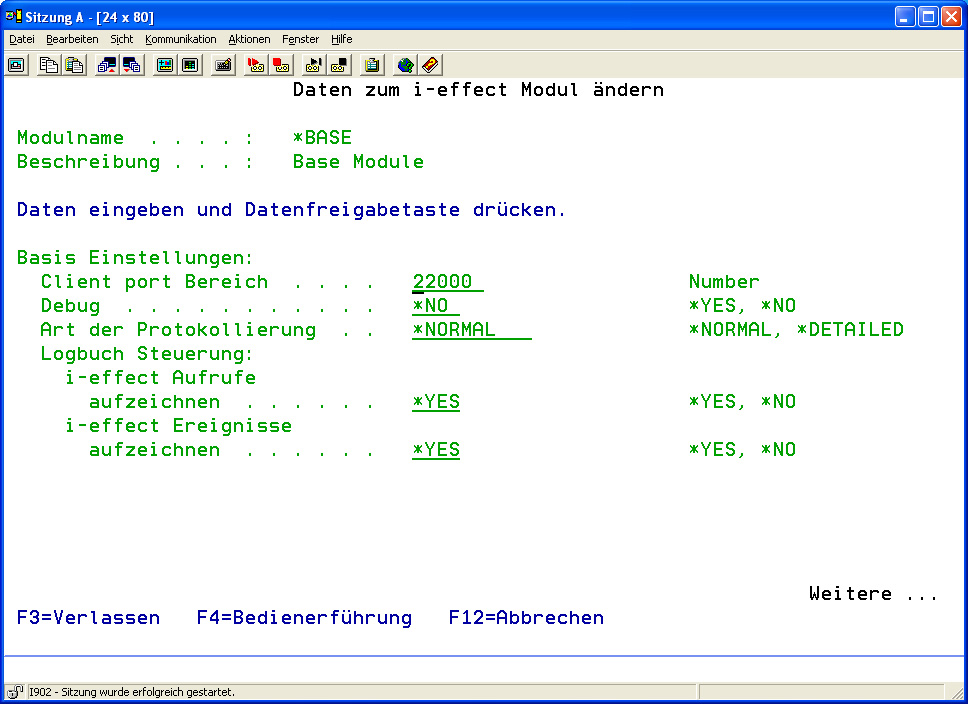 Wählen Sie mit Auswahl 8 das Modul *BASE aus. Nehmen Sie in der Anzeige „Daten zum i-effect Modul ändern" Ihre Änderungen vor.