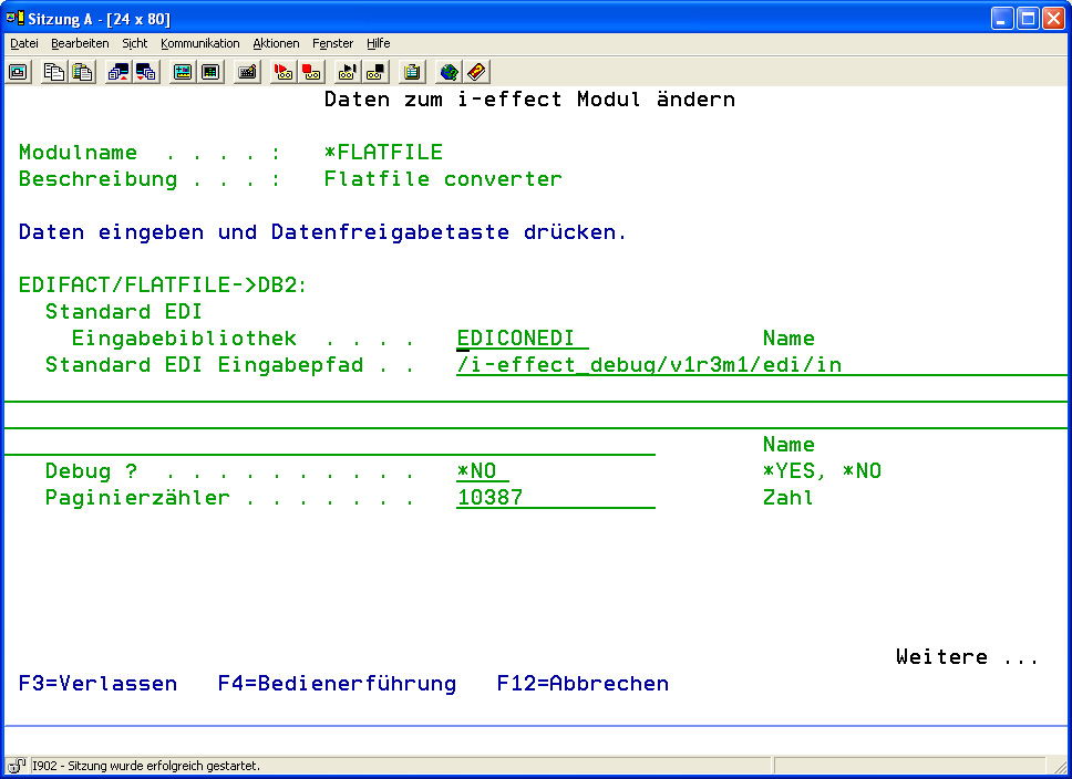 Wählen Sie mit Auswahl 8 das *FLATFILE-Modul aus. Nehmen Sie in der Anzeige „Daten zum i-effect Modul ändern" Ihre Änderungen vor.