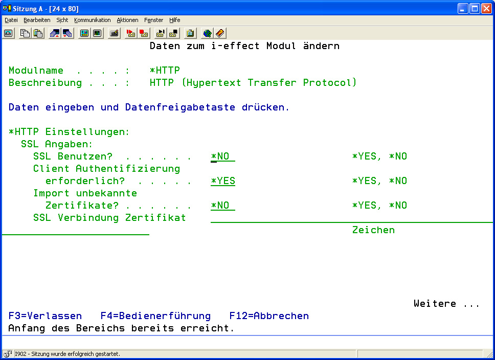 | Client Authentifizierung erforderlich? | Bei der Auswahl *YES für den Parameter „SSL" können Sie in diesem Parameter angeben, ob der HTTP Client sich gegenüber (Ihrem) Server mit seinem X509 Zertifikat authentifizieren muss. Wenn Sie hier die Auswahl *YES treffen und im nachfolgenden Parameter "Import nicht vertrauenswürdiger Zertifikate" den Wert *NO angeben, muss das Zertifikat Ihres Partners schon vor dem Verbindungsaufbau in Ihrem Keystore vorhanden sein. Somit ist gewährleistet, dass das über die aufgebaute HTTPS-Verbindung automatisch gesendete Zertifikat Ihres Partners vom *HTTP-Server geprüft werden kann. Nur wenn diese Prüfung des vom Client gesendeten Zertifikates gegen das Zertifikat aus Ihrem Keystore erfolgreich ist, akzeptiert der HTTP-Server die eingehende Verbindung. Andernfalls schließt er die vom Client aufgebaute Verbindung, da nicht sichergestellt ist, dass es wirklich Ihr Partner ist, der versucht eine Daten an Sie zu senden. Geben Sie in diesem Parameter den Wert *NO an, findet die Prüfung des Zertifikats während des Verbindungsaufbaus nicht statt. | |