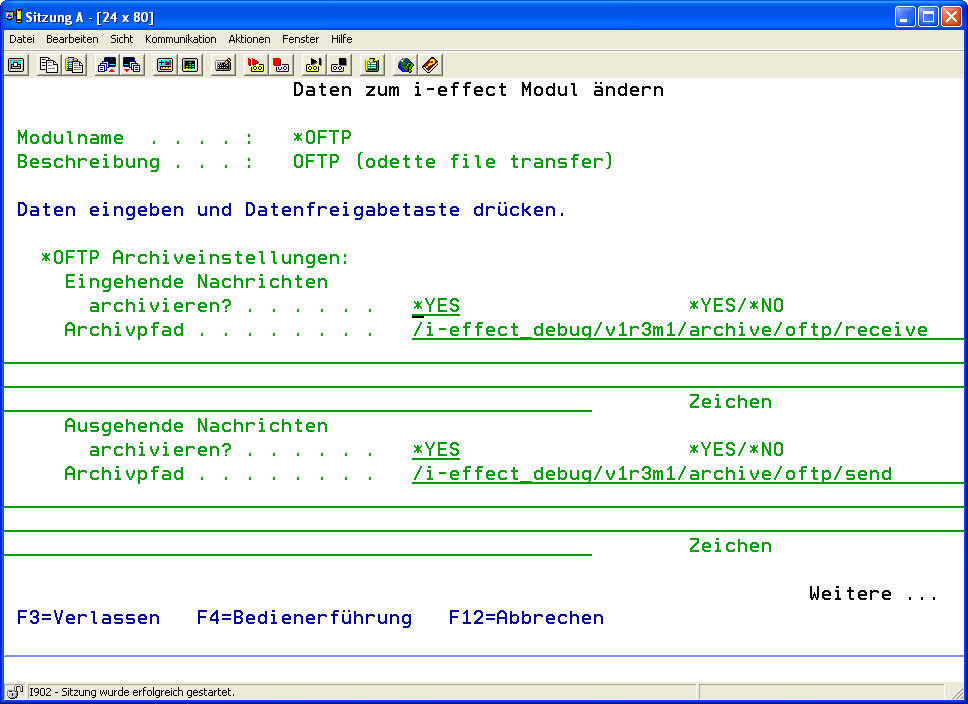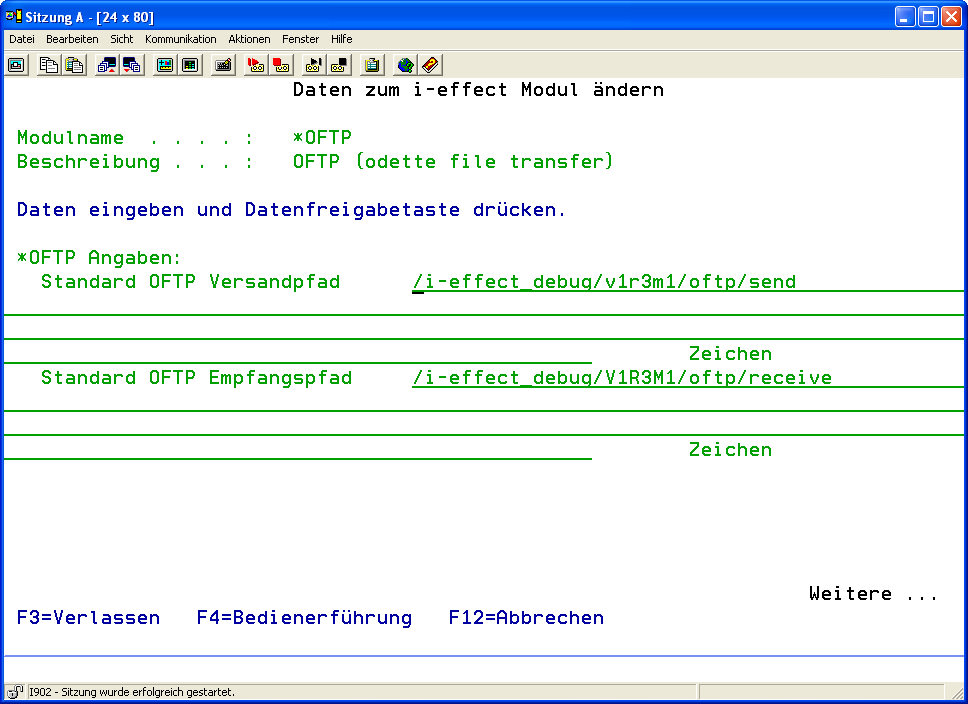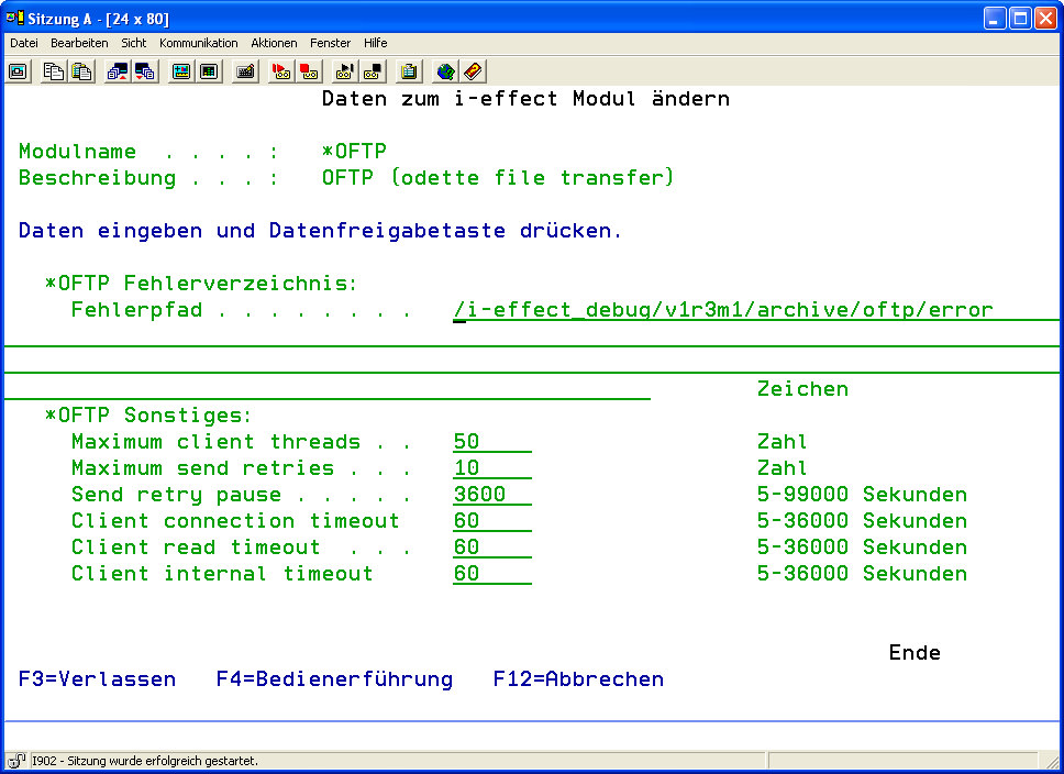 Wählen Sie mit Auswahl 8 das Modul *OFTP aus. Nehmen Sie in der Anzeige „Daten zum i-effect Modul ändern“ Ihre Änderungen vor.