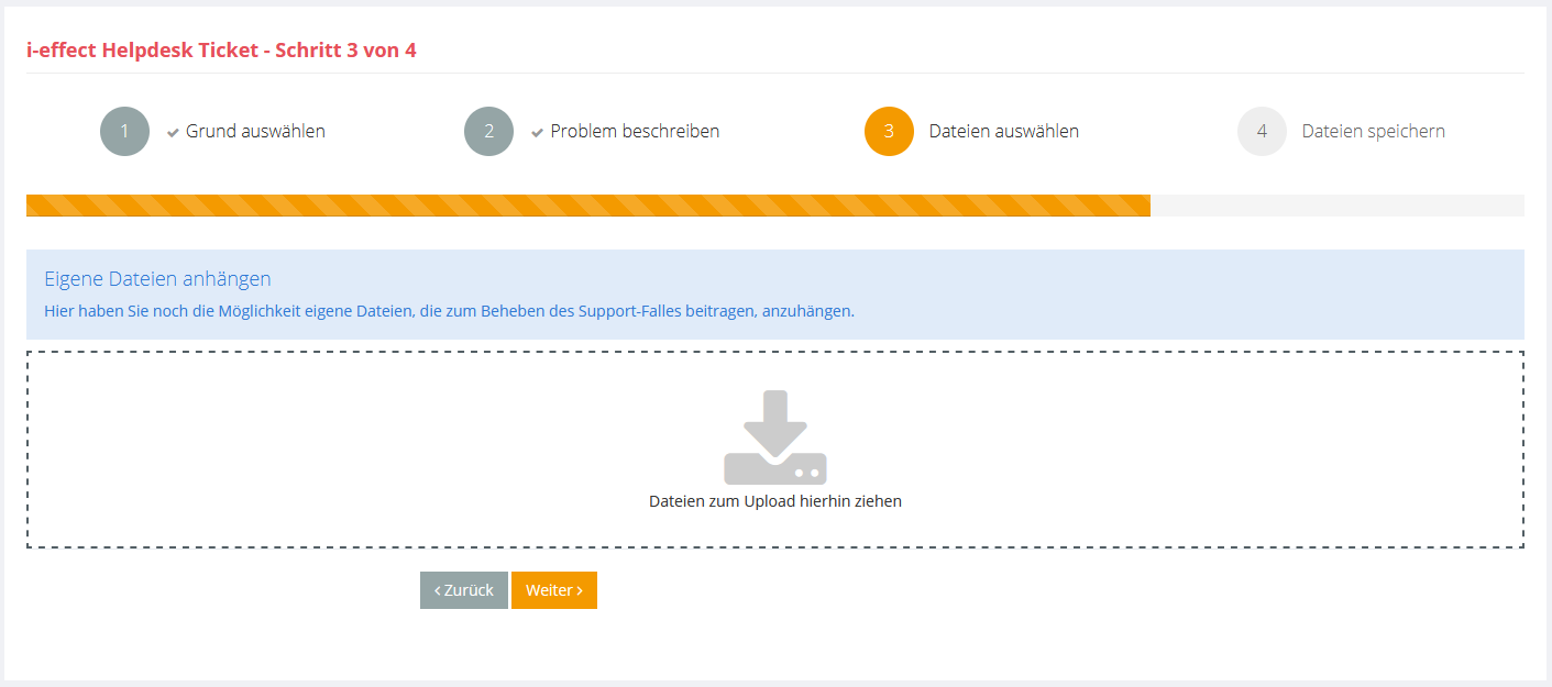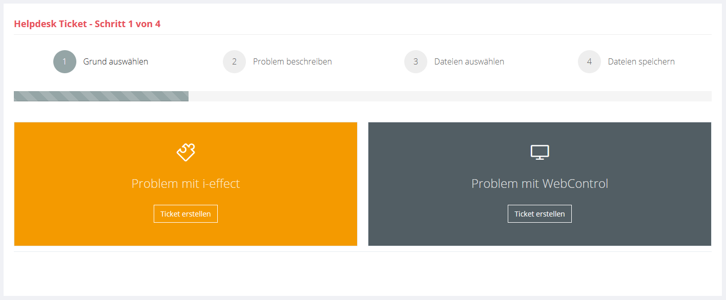 Je nach Auswahl - i-effect oder WebControl - können Sie Dateien hochladen und automatisch weitere Supportinformationen sammeln lassen.