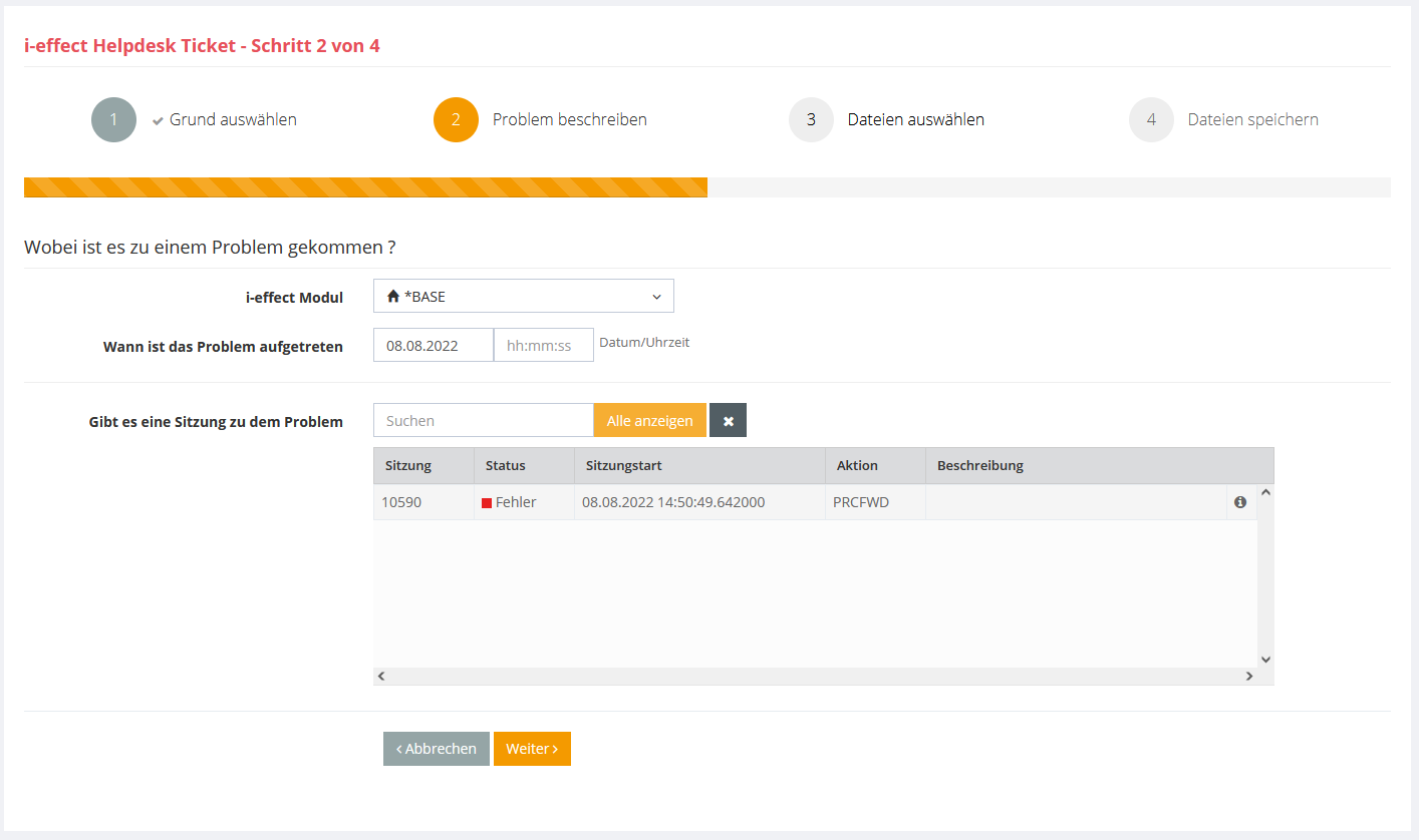 Der Bereich i-effect bietet die Möglichkeit genaue Angaben zu dem betroffenen Modul und dem Zeitpunkt des Problems zu machen. Falls vorhanden kann dabei auch eine Sitzung ausgewählt werden, wodurch automatisch Sitzungsdaten und Log-Dateien passend zum angegebenen Zeitpunkt, zum Modul und zur Sitzung gesucht und hinzugefügt werden.