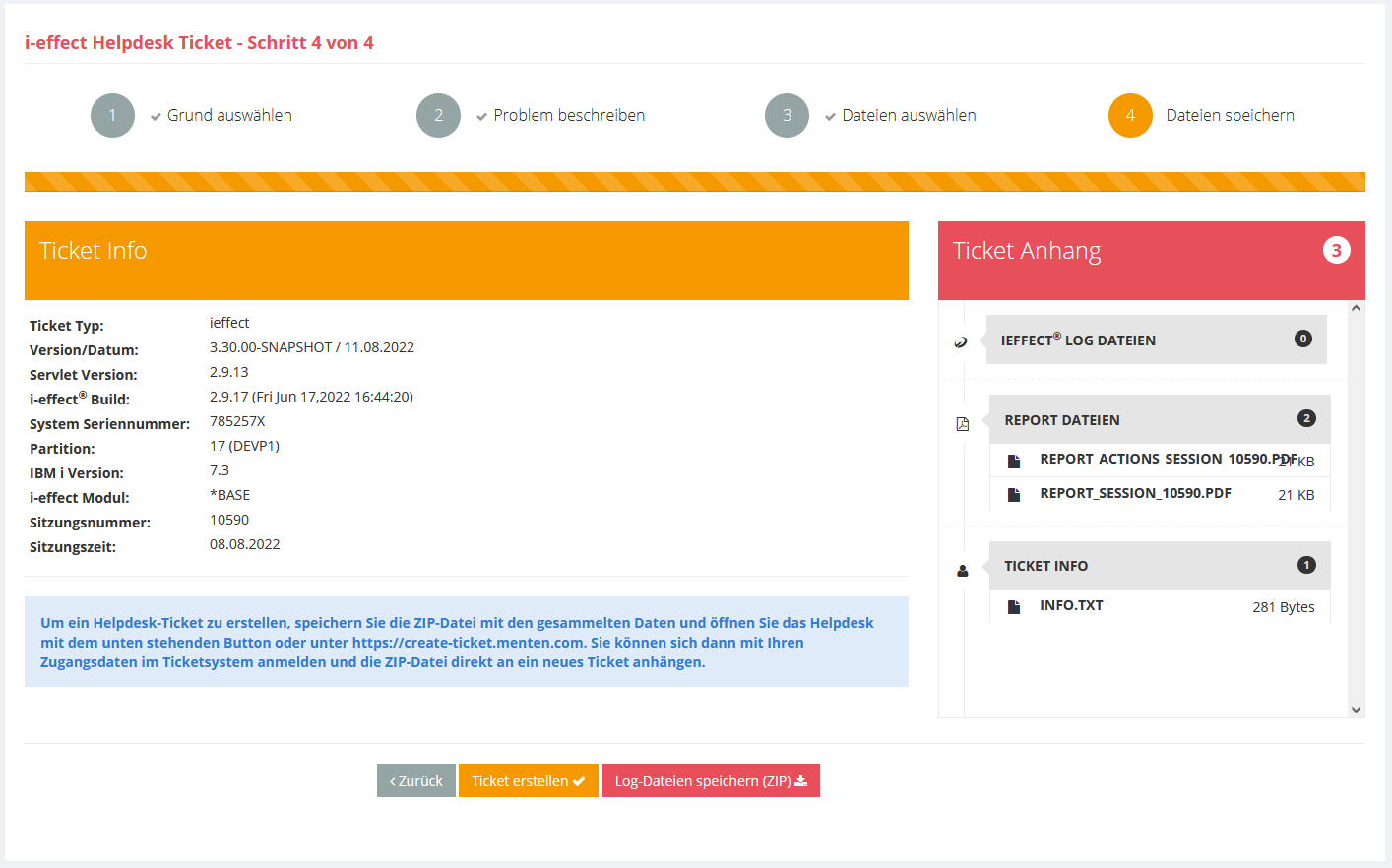 Mit den unten stehenden Buttons kann eine ZIP-Datei mit allen Infos gespeichert werden, und Sie werden auf die Seite zum Erstellen eines Support-Ticket verlinkt.