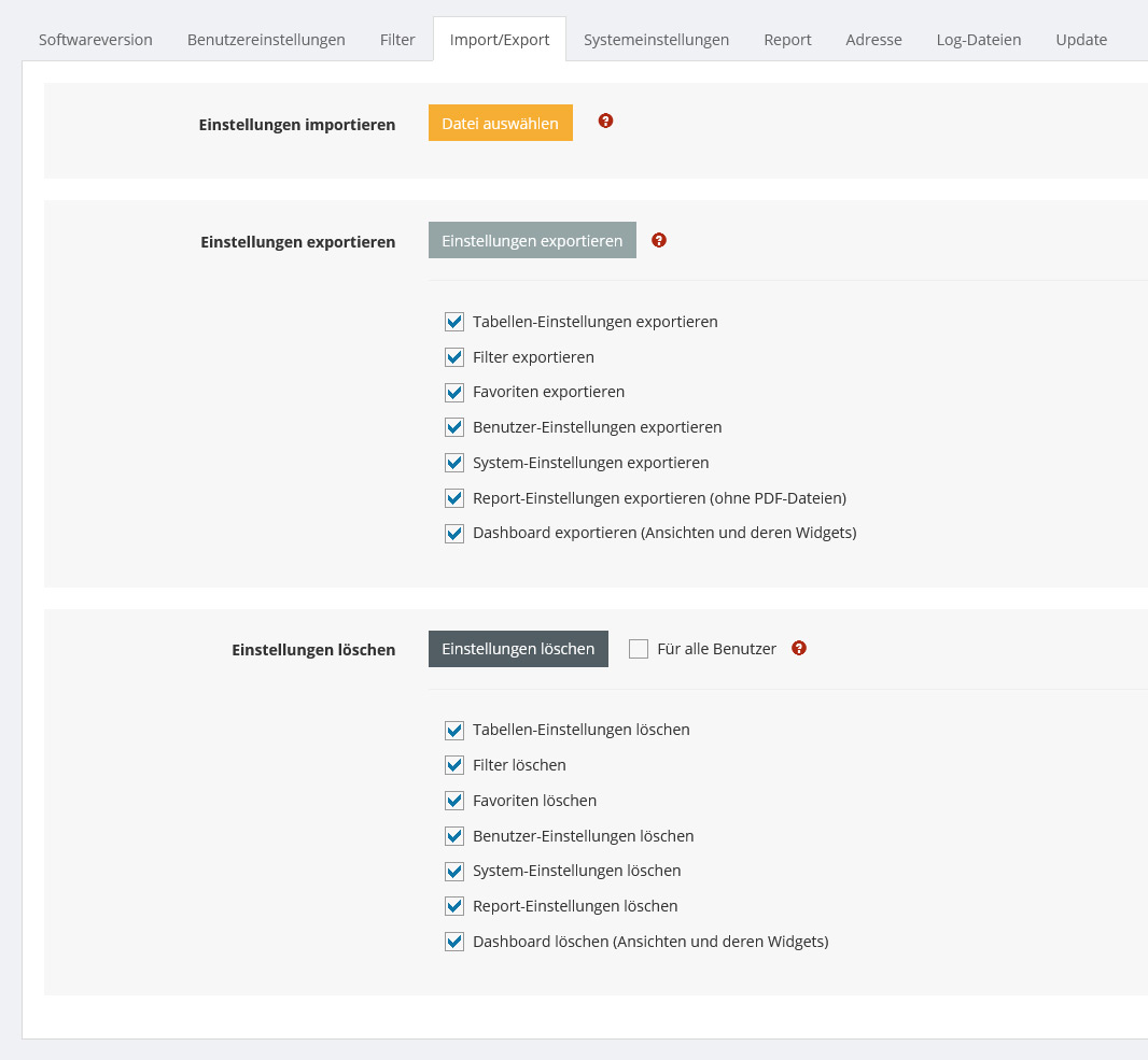 Speichert alle Einstellungen und Filter für den angemeldeten Benutzer in eine Datei. Es kann ausgewählt werden, welche Einstellungen exportiert werden.
