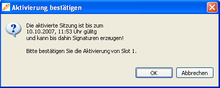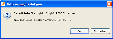 Um der Anforderung des deutschen Signaturgesetztes bzw. der deutschen Signaturverordnung gerecht zu werden, wird vor dem eigentlichen Aktivieren einer Sitzung ein Bestätigungsdialog angezeigt.
