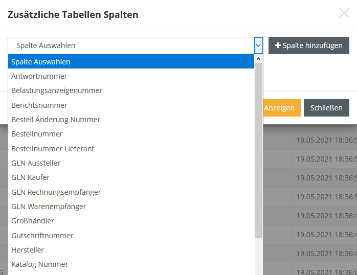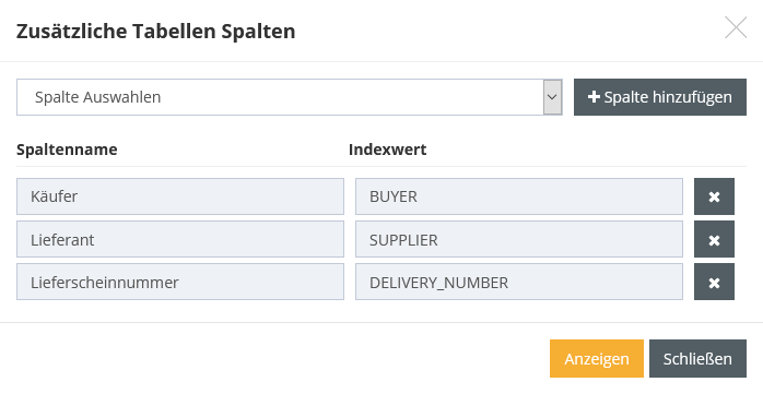 Durch das Auswählen eines Wertes und einen Klick auf den Button "Spalte hinzufügen" wird der Wert in die Liste der angezeigten Indexwerte aufgenommen. Es können bis zu 15 Indexwerte zur Ansicht hinzugefügt werden.