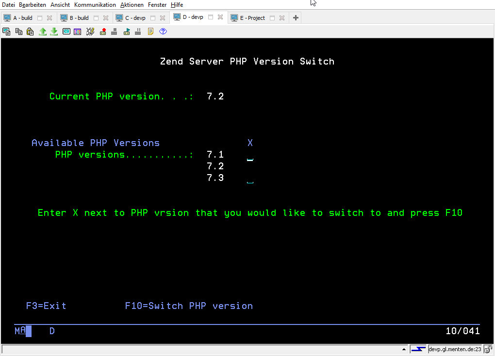 Nun muss der ZendServer neu gestartet werden: Im Greenscreen "go zendphp7/zsmenu" aufrufen und mit Auswahl 11 den ZendServer beenden. Dann mit Auswahl 1 wieder starten.
