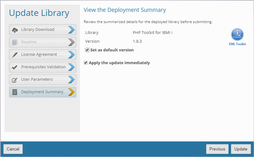 Das XML-Toolkit for IBM i sollte immer auf die neuste angezeigte Version aktualisiert werden, die neuste Version muss als als Default gesetzt werden.