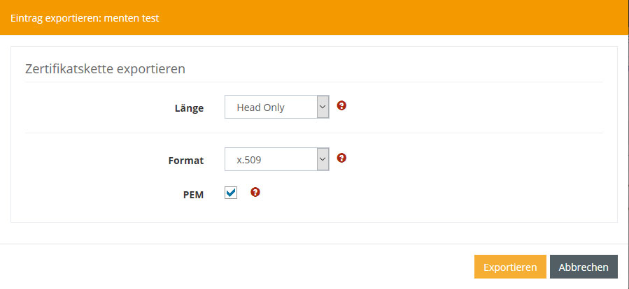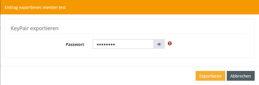 Zertifikate vom Typ "PAIR" können als KeyPair oder als Zertifikatskette exportiert werden. Beim Export können je nach gewähltem Typ verschiedene Parameter eingegeben werden.