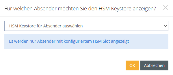 Die HSM KeystoreAuswahl wird angezeigt, wenn in der Modul-Konfiguration für das Modul *AS4 die Pfade und Zugangsdaten zur HSM eingetragen sind. Zusätzlich muss der anzuzeigende HSM Slot in den AS4 Absender Stammdaten für den entsprechenden Absender eingetragen werden. Sind beide Voraussetzungen erfüllt, wird kann ein HSM Keystore ausgewählt werden.