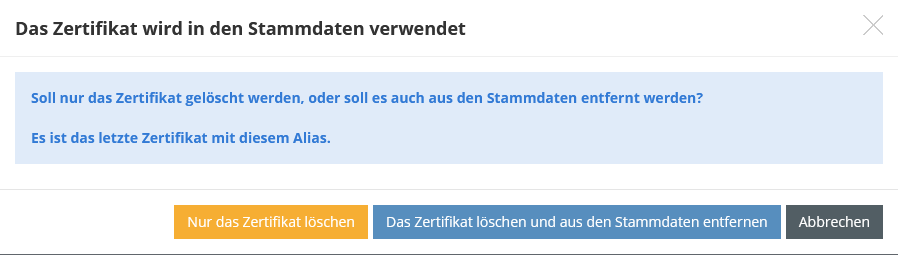 Es kann dann wahlweise nur das Zertifikat gelöscht werden, oder zusätzlich das Zertifikat aus allen betroffenen Stammdaten entfernt werden.