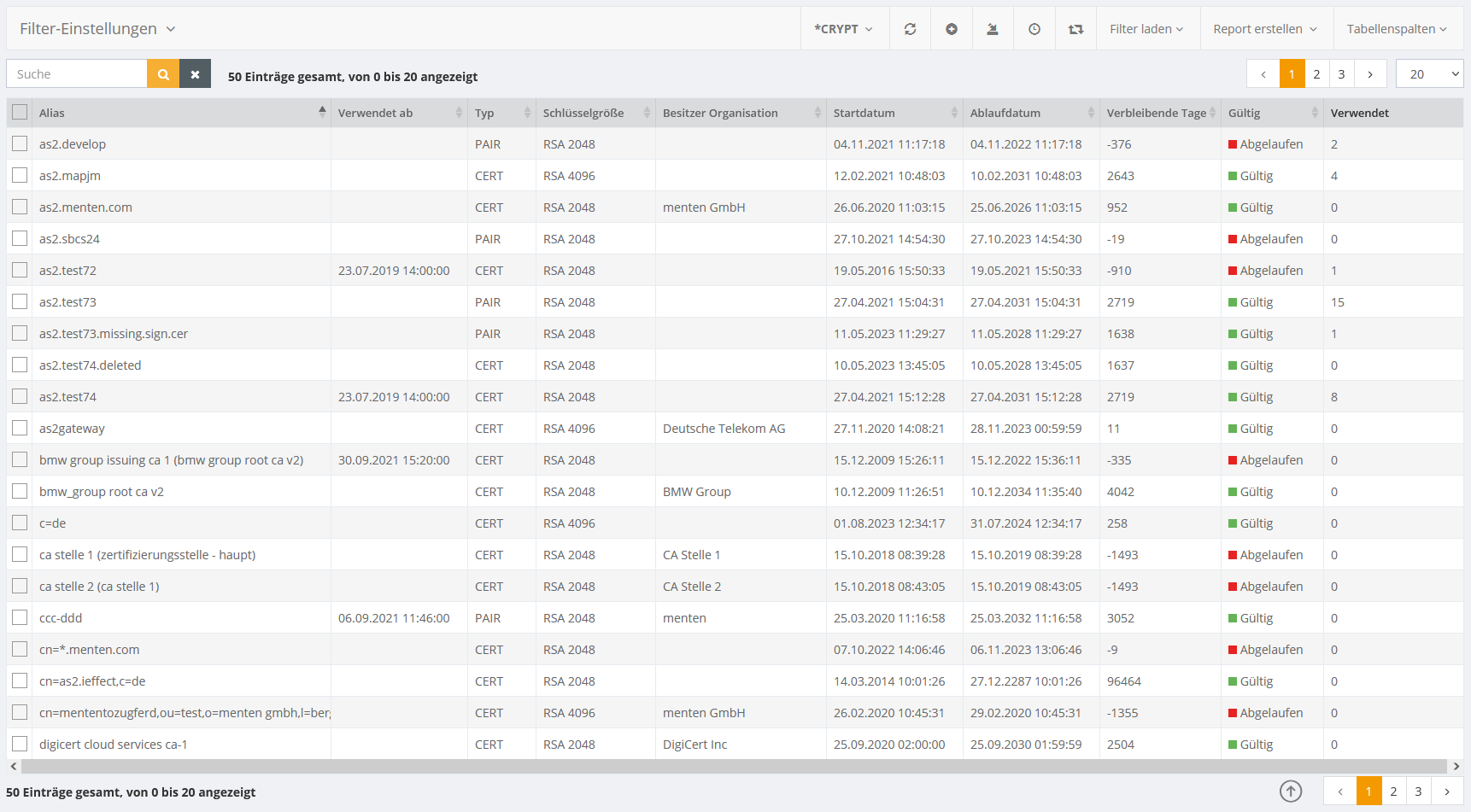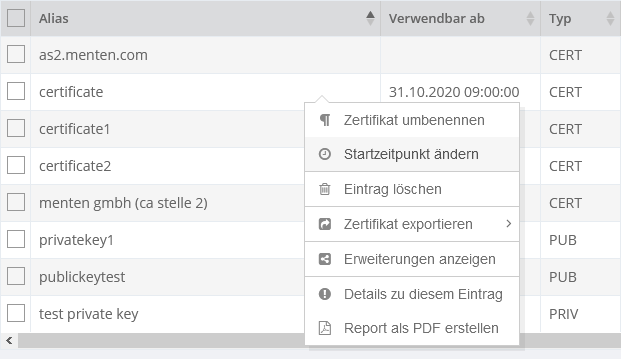 Alias und Startzeitpunkt lassen sich auch nachträglich für bereits importierte Zertifikate ändern, die in der Tabelle als CERT oder PAIR gelistet werden.