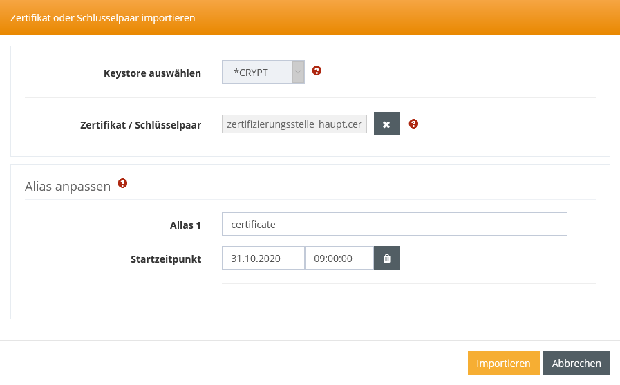 Neben dem Alias kann für Zertifikae in den Formaten .der / .pem / .cer / .crt / .cert / .p7b / .p12 ein Startzeitpunkt festgelegt werden, ab dem das Zertifikat verwendet wird.